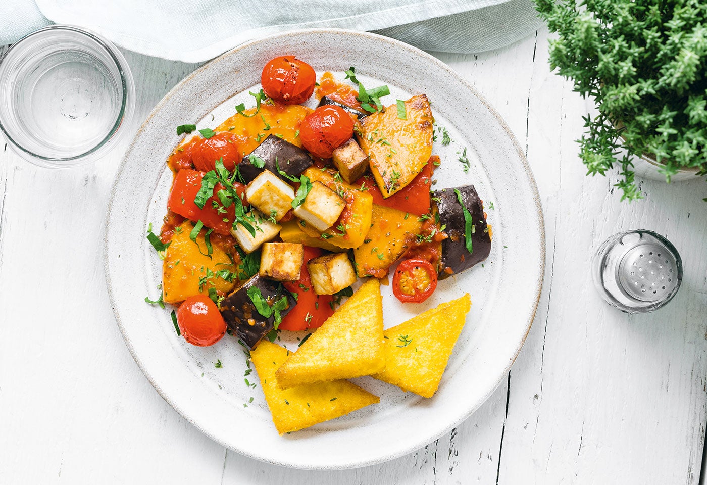 Kürbis-Ratatouille mit Tofu und knusprigen Polenta-Ecken