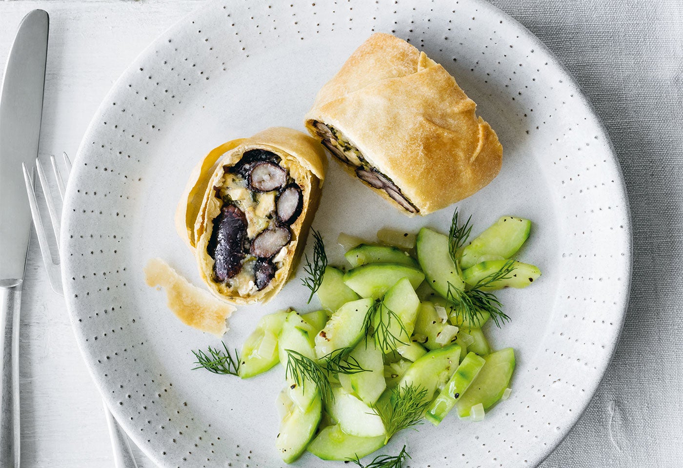 Käferbohnen-Tofu-Strudel mit geschmorrten Gurken