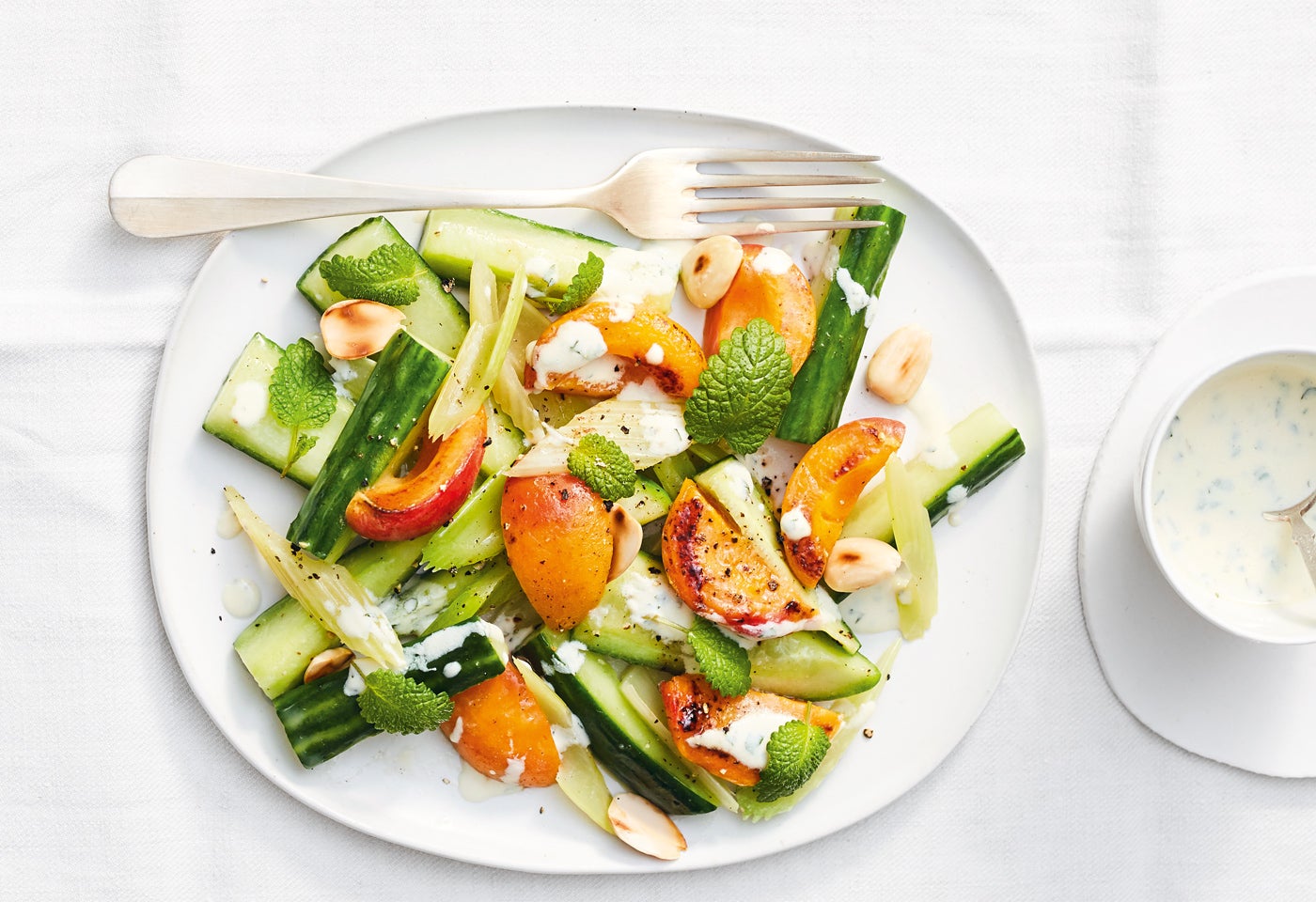 Gurken-Sellerie-Salat mit gebratenen Marillen und Tofu-Dressing