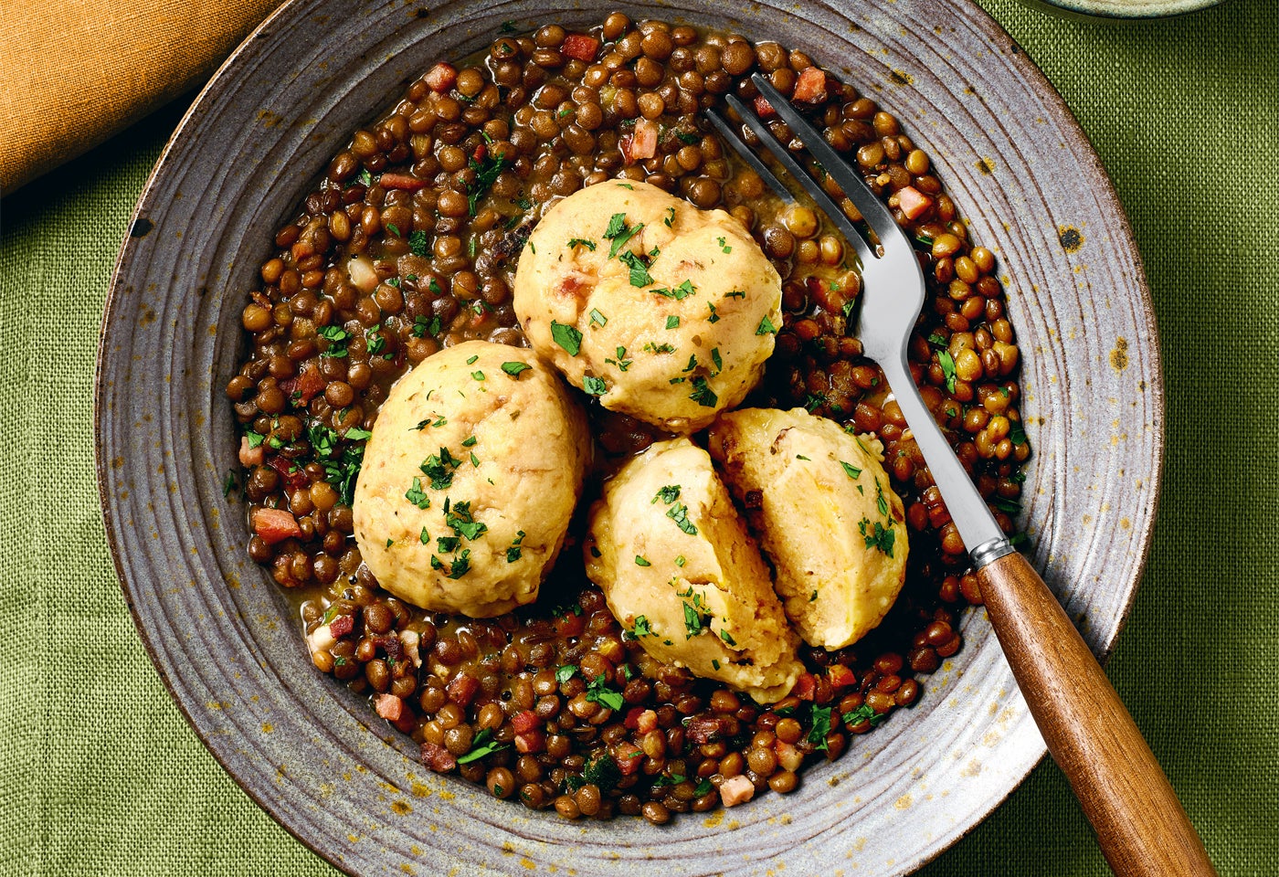 Speckknödel mit Specklinsen und Krautsalat