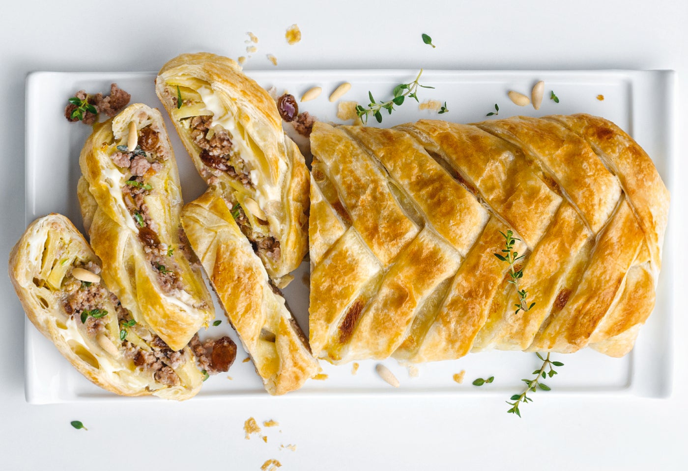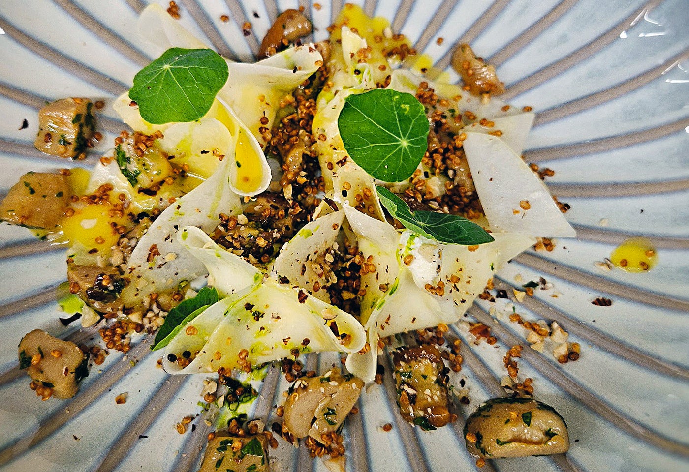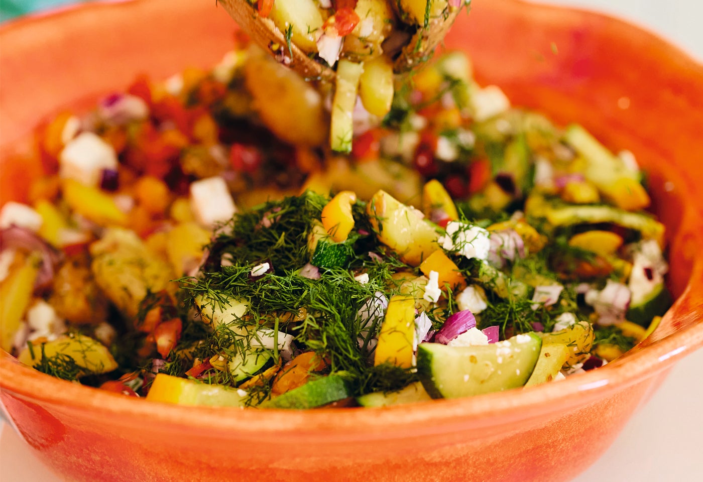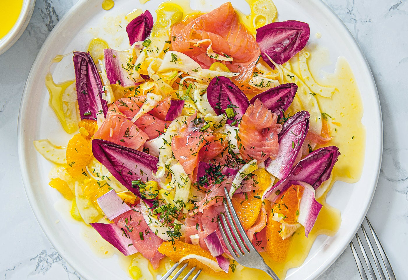 Gebackener Gouda in Dukkah-Panier mit Rotkraut-Zwetschken-Salat