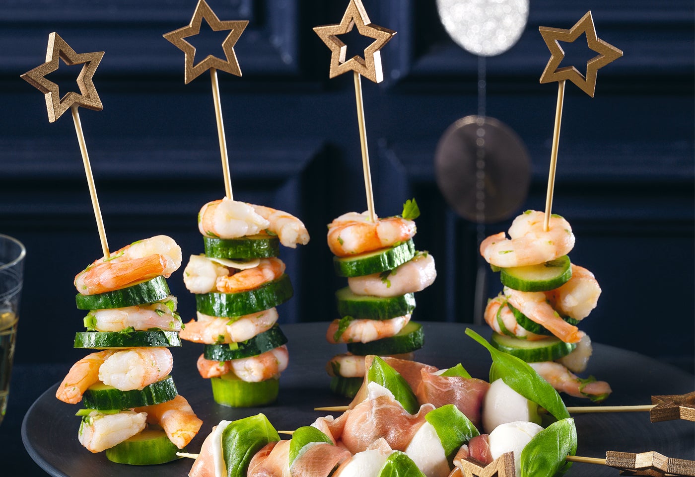 Getrüffelte Mozzarella-Prosciutto-Spieße & Gurken-Garnelen-Spieße mit Guacamole