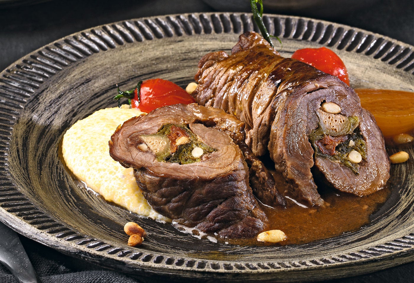 Rindsrouladen auf italienische Art mit Honigtomaten und Parmesanpolenta