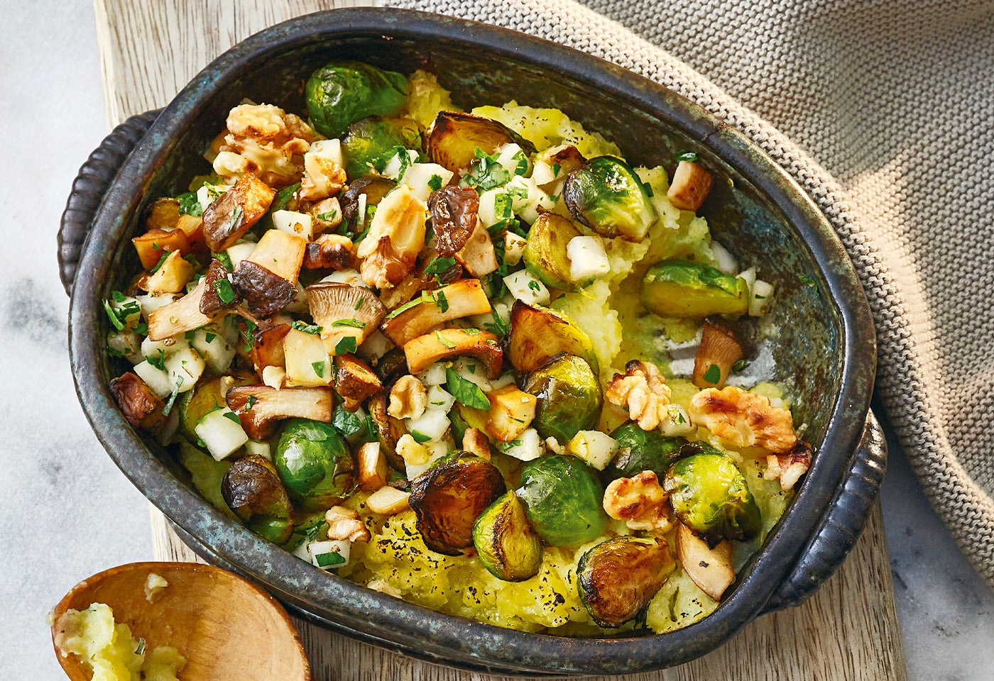Erdäpfel-Kohlsprossen-Auflauf mit Pilzen und Birnen
