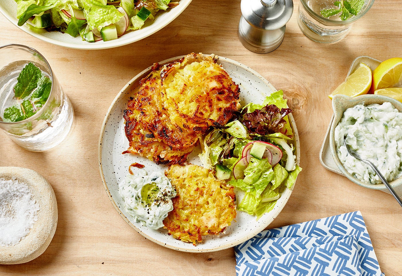 Erdäpfel-Puffer mit plant-based Hirtengenuss-Tzaziki