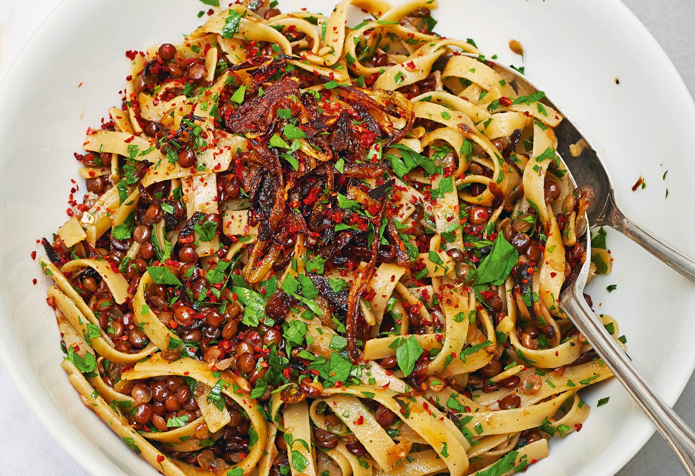 Linsen mit Nudeln und karamellisierten Zwiebeln