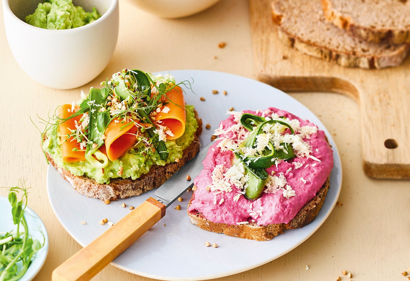 Jausenbrote aus Sauerteig: Pflanzenlachs-Avocado-Brot & Rote-Rüben-Hummus-Gurkenpickle-Brot