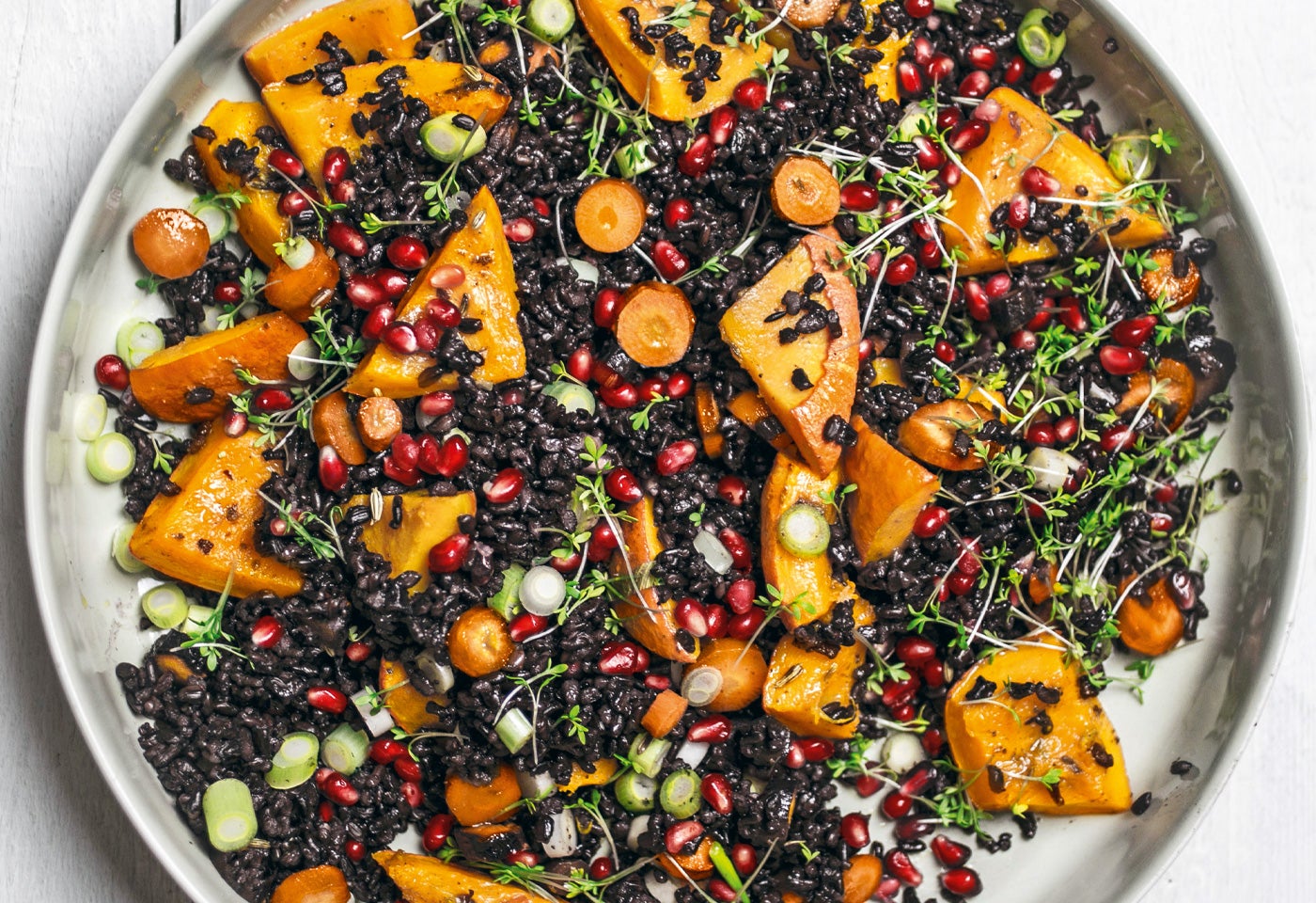 Lauwarmer Kürbis-Reis-Salat mit Granatapfelkernen