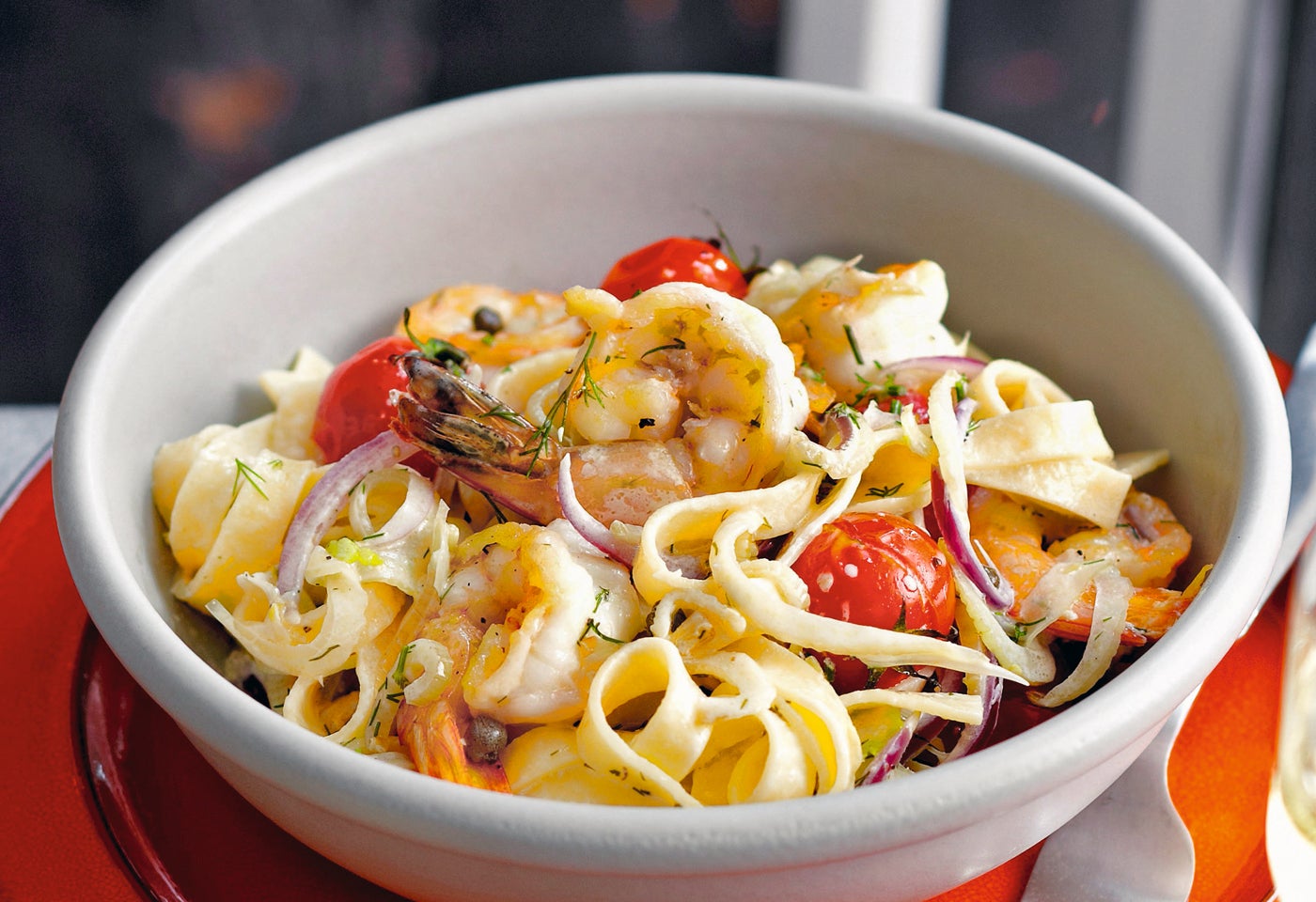 Bandnudeln mit Garnelen, Fenchel und Tomaten