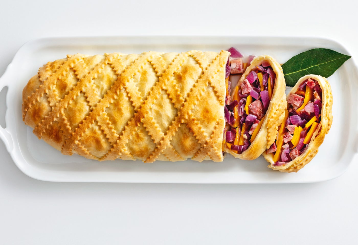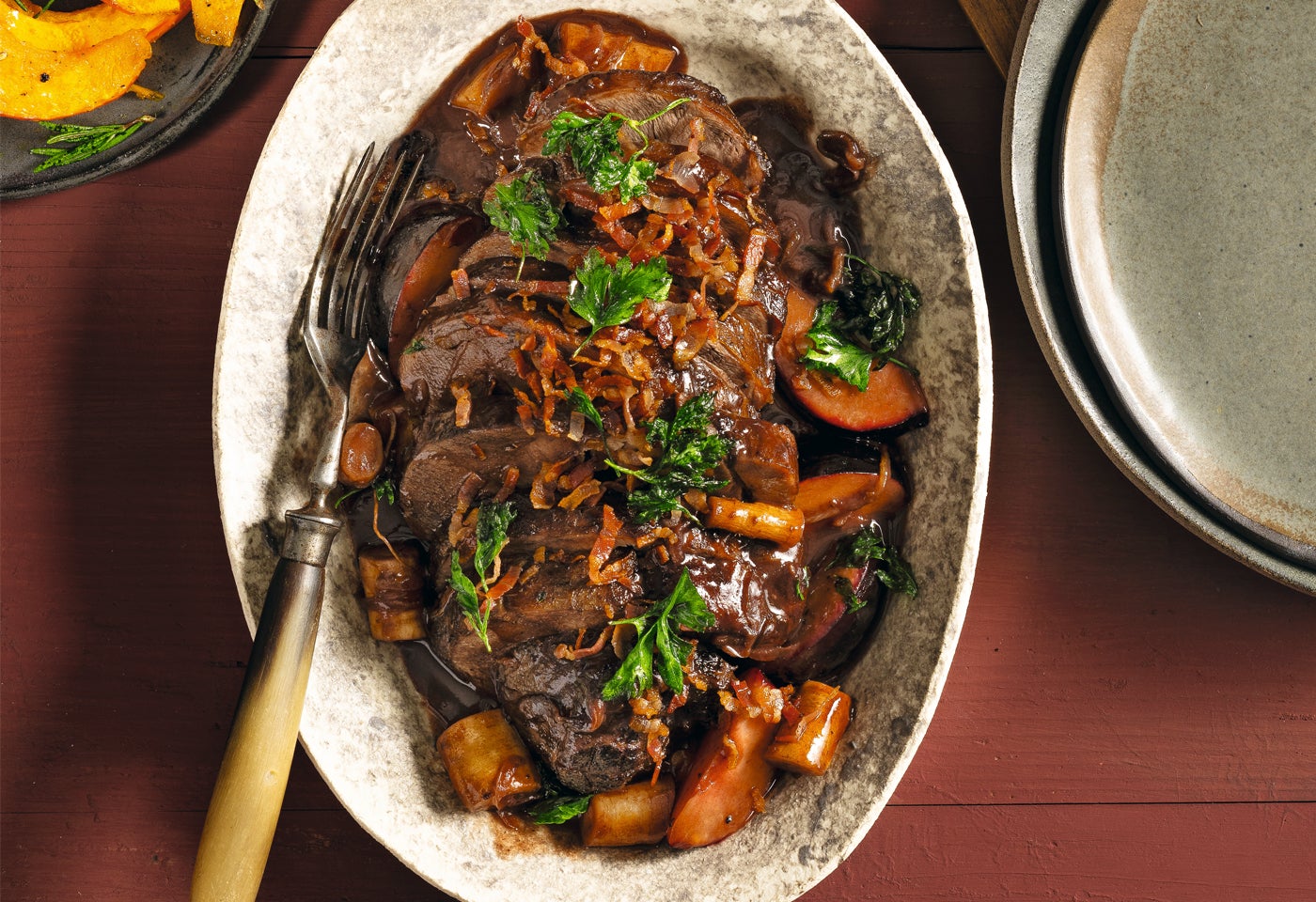 Hirschrollbraten mit Rosmarin-Honig-Kürbis und Pflaumen