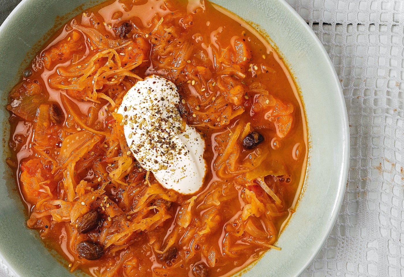 Tomaten-Krautsuppe mit Za’atar und Rosinen