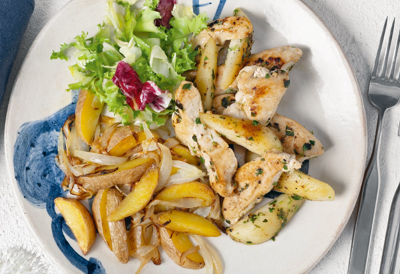 Hendlfilet mit Erdäpfeln, Birnen und Salat