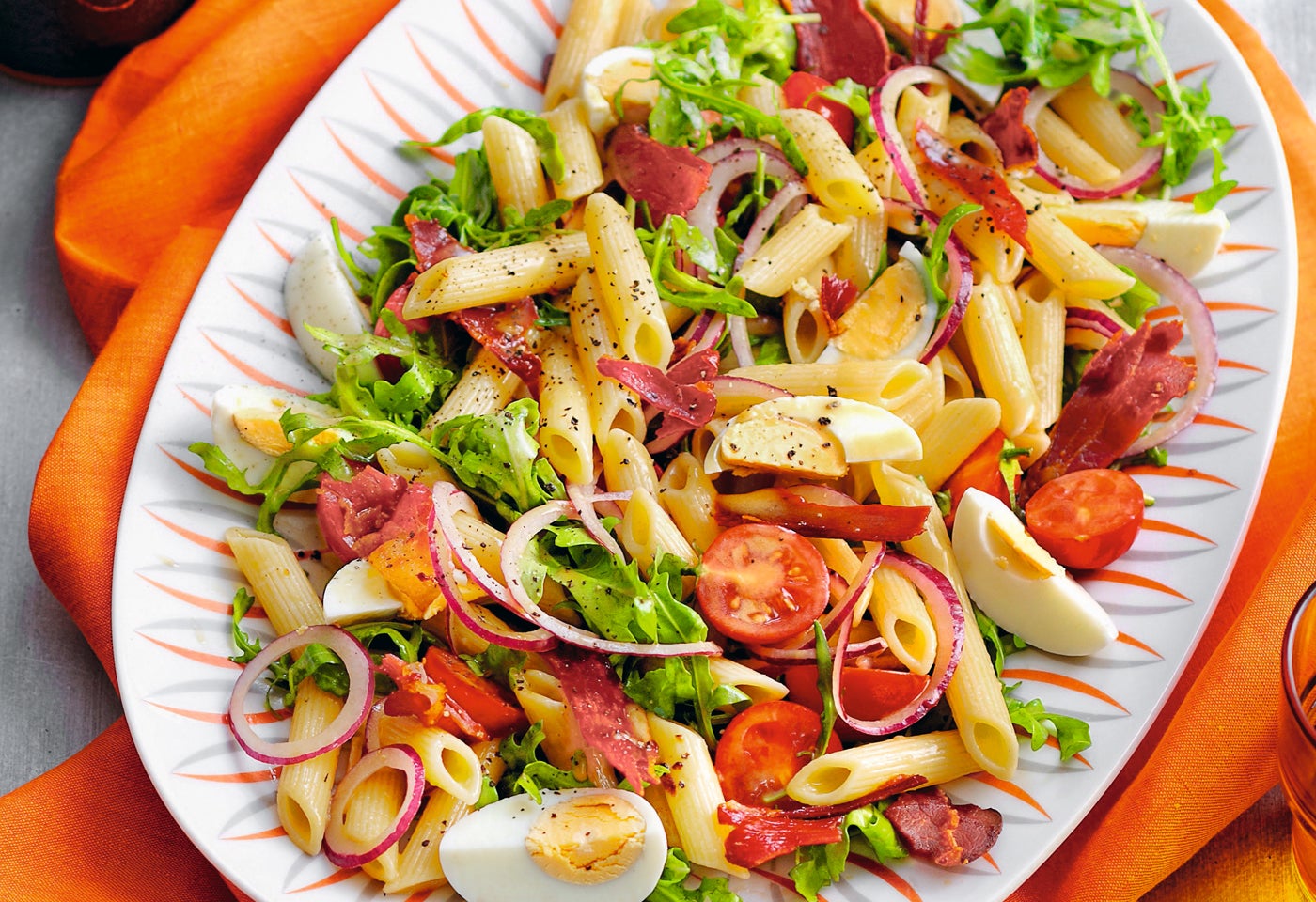Nudelsalat mit Prosciutto, Ei und Sardellenmarinade