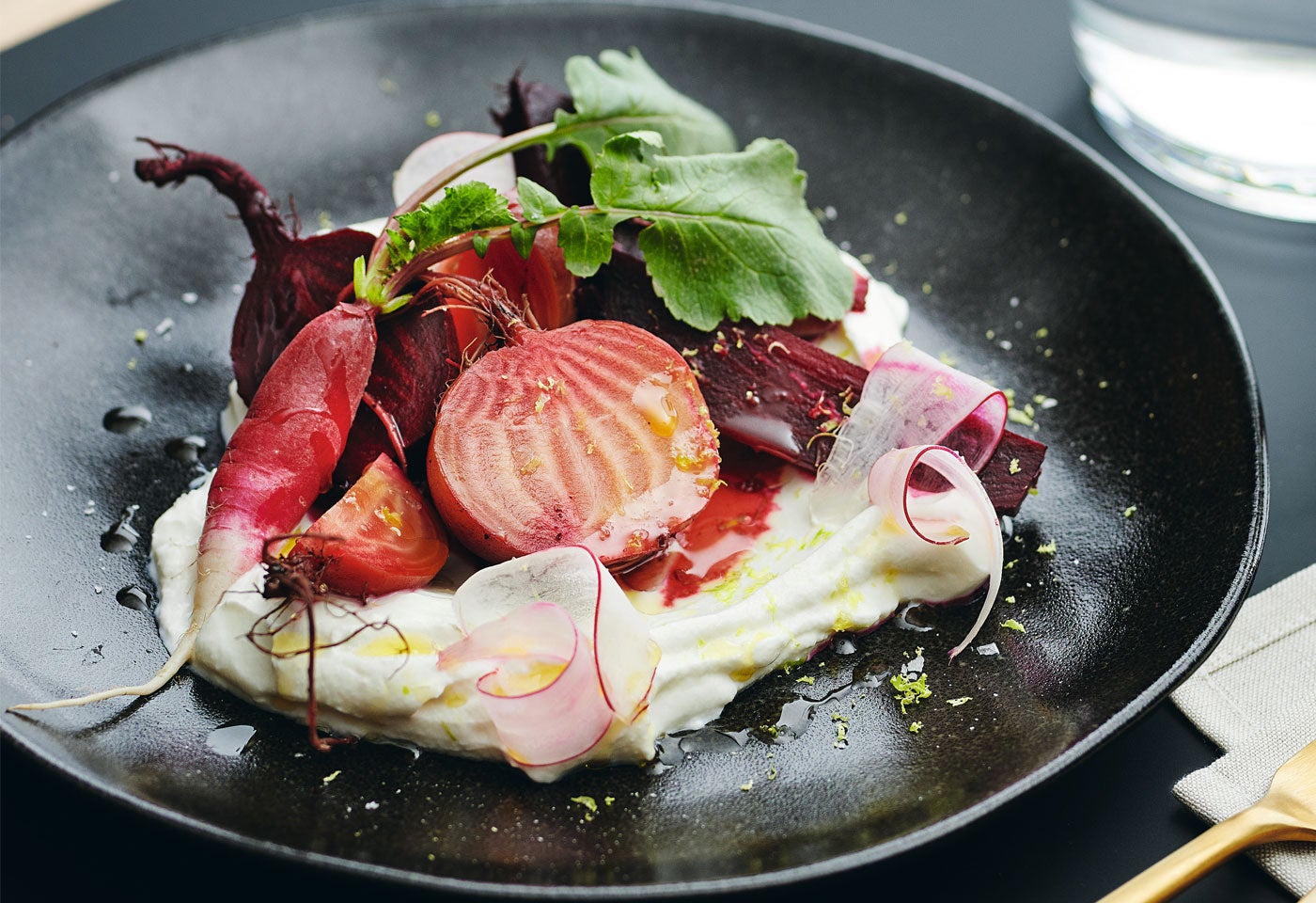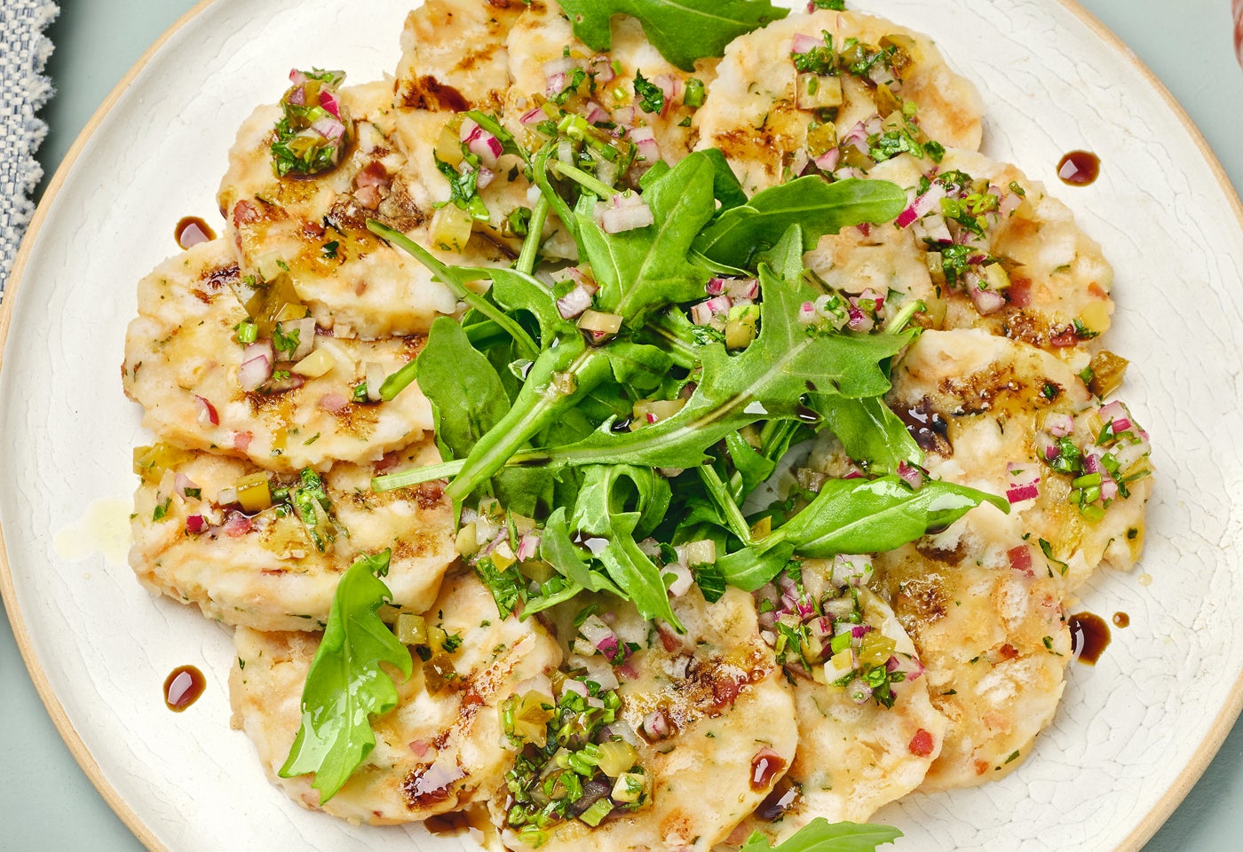 Knödel-Carpaccio mit Gewürzgurkenvinaigrette und Rucola