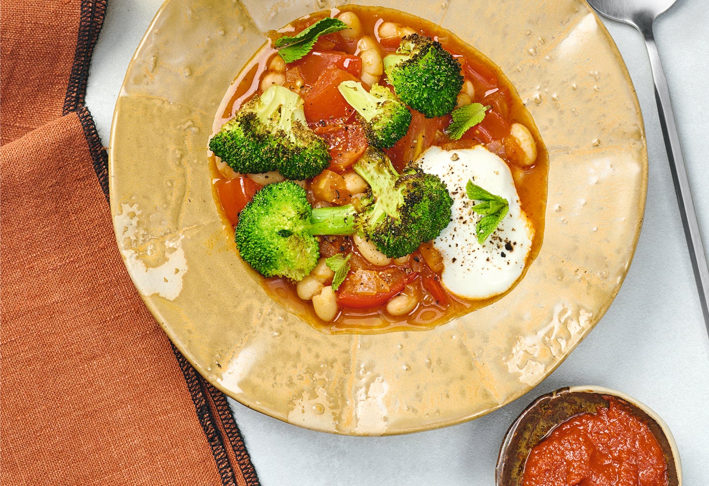 Bohnen-Harissa-Chili mit Ofenbrokkoli