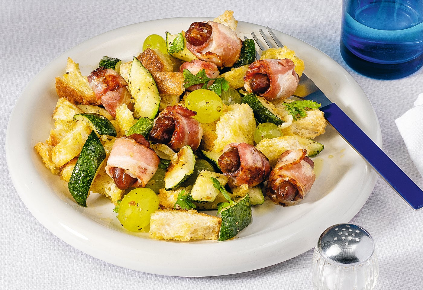 Zucchini-Trauben-Brotsalat mit Speckdatteln