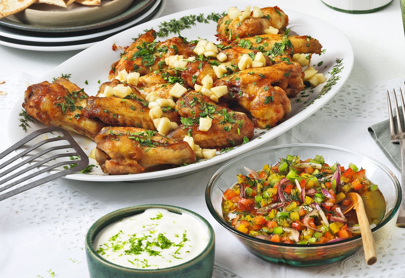 Würzige Hendlflügerl mit Honig-Birnen und Salsa Criolla