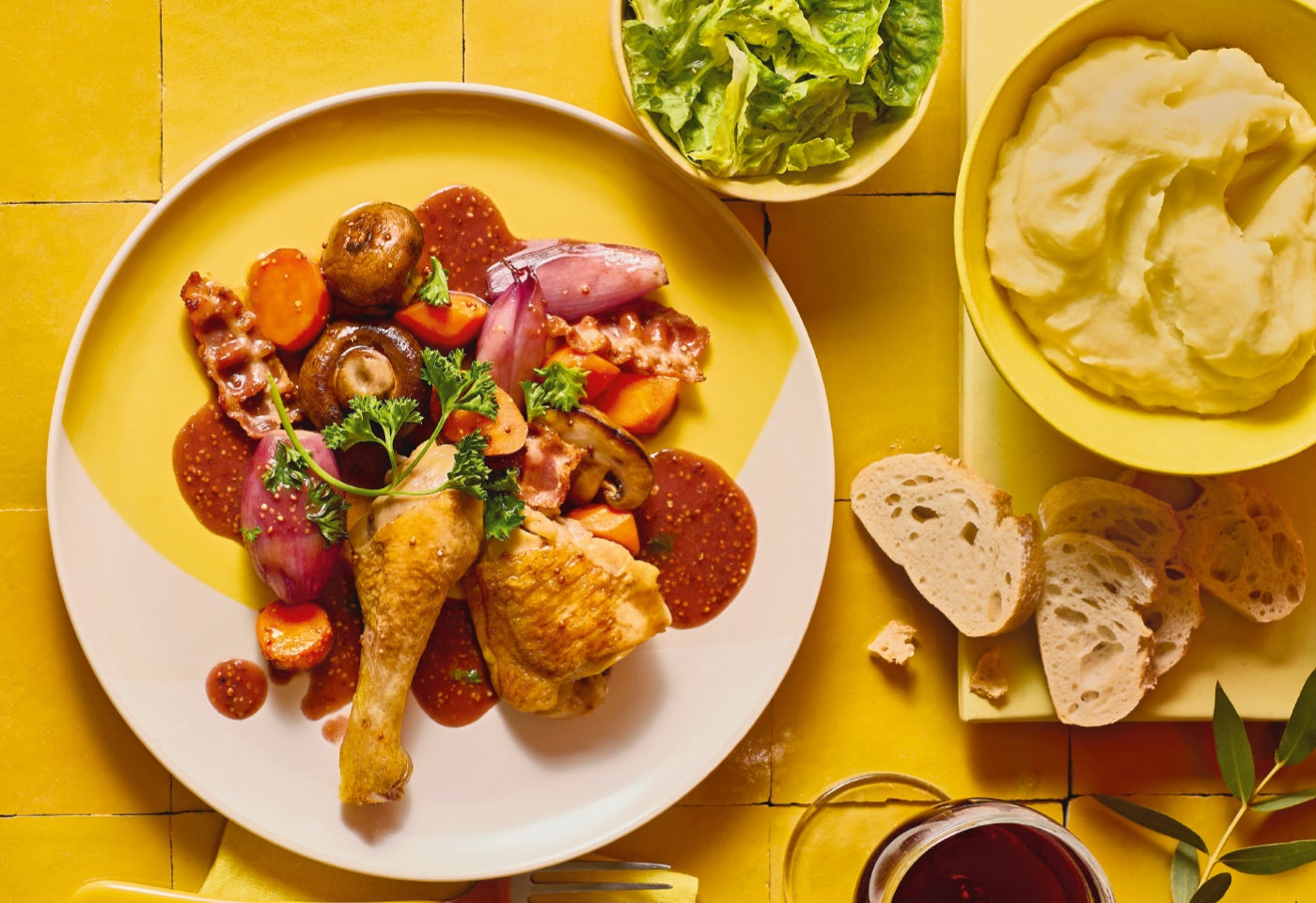 Französisches Hendl in Rotwein-Cognac-Sauce mit Schmorgemüse