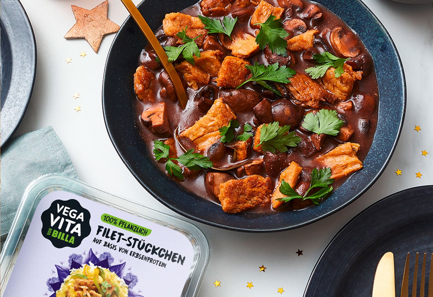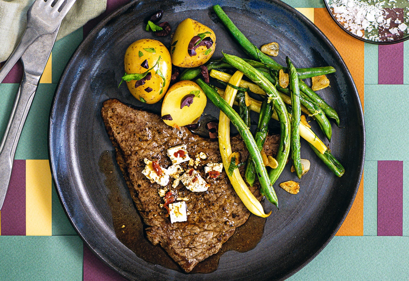 Veltliner-Rindsschnitzel mit Minz-Fisolen, Oliven-Erdäpfeln und Schafkäse