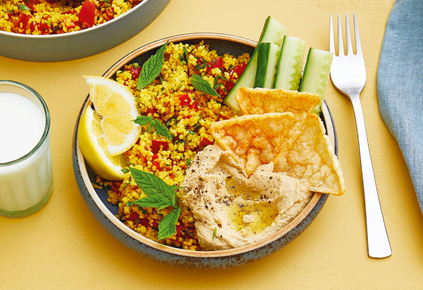 Curry-Taboulé mit Hummus und Kichererbsenchips