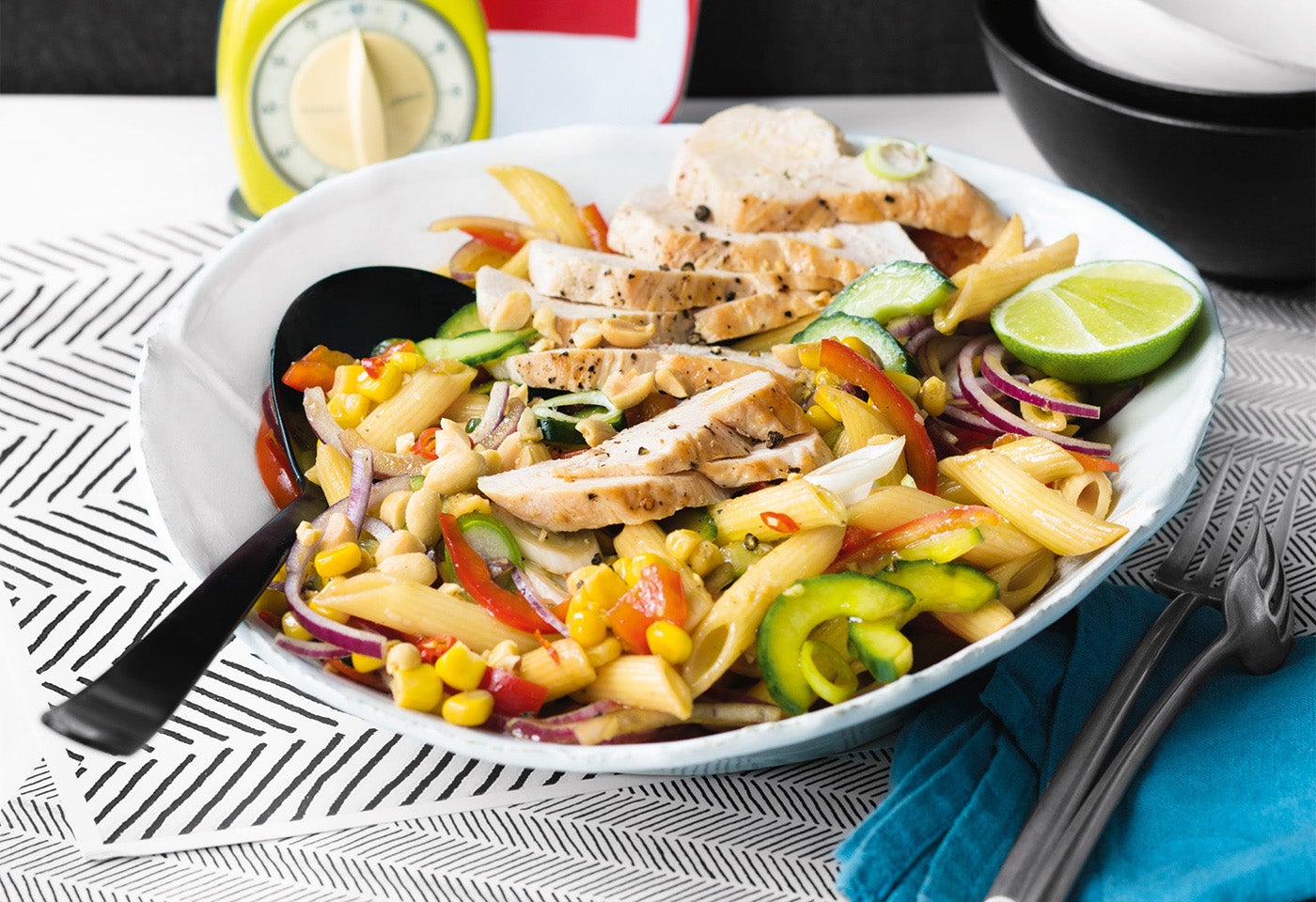 Nudelsalat mit Hühnerbruststreifen und Limettenmarinade