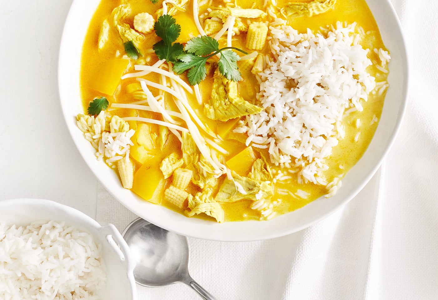 Kokos-Hühnereintopf mit Paprika und Maiskölbchen