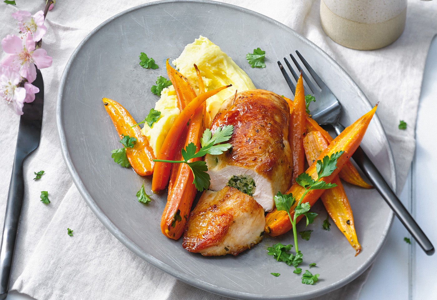 Gefülltes Hühnerfilet mit Honigkarotten und Erdäpfelpüree