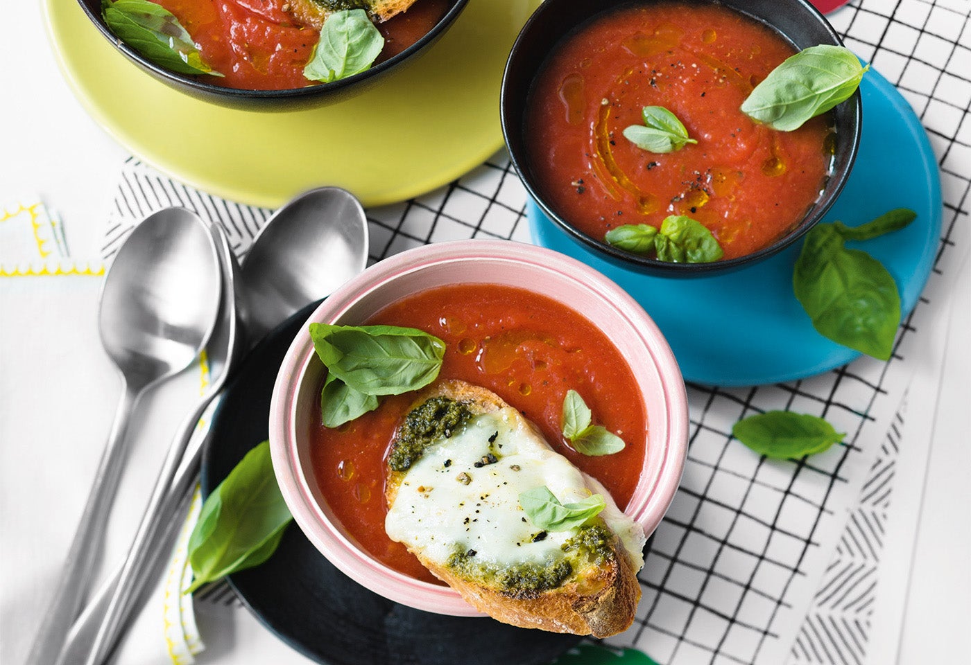 Tomatensuppe mit Pesto-Mozzarella-Crostini