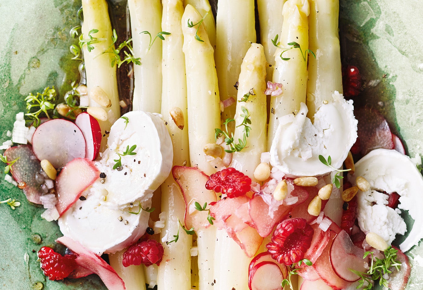 Spargel mit Ziegenkäse und Himbeer-Rhabarber-Vinaigrette
