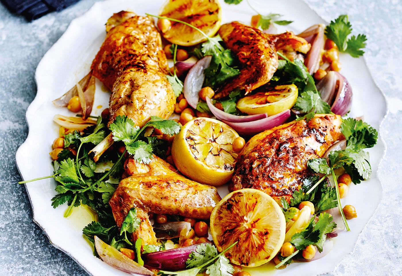Knuspriges Ofenhuhn mit Kichererbsengemüse und gegrillten Zitronen