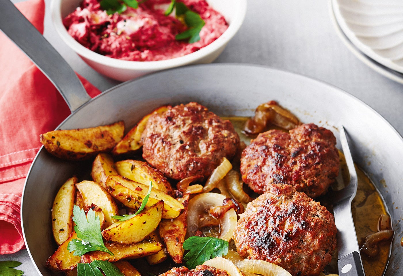 Faschierte Laibchen mit Wedges, Zwiebeln und Rote-Rüben-Kren-Dip