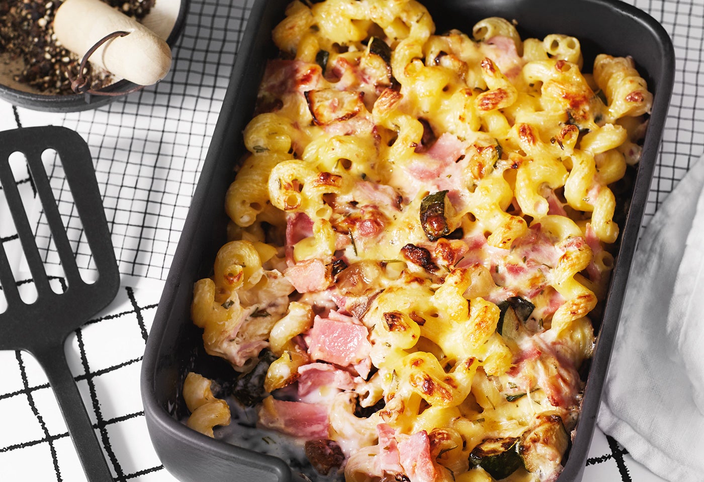Schinken-Zucchini-Nudelauflauf mit Blattsalat