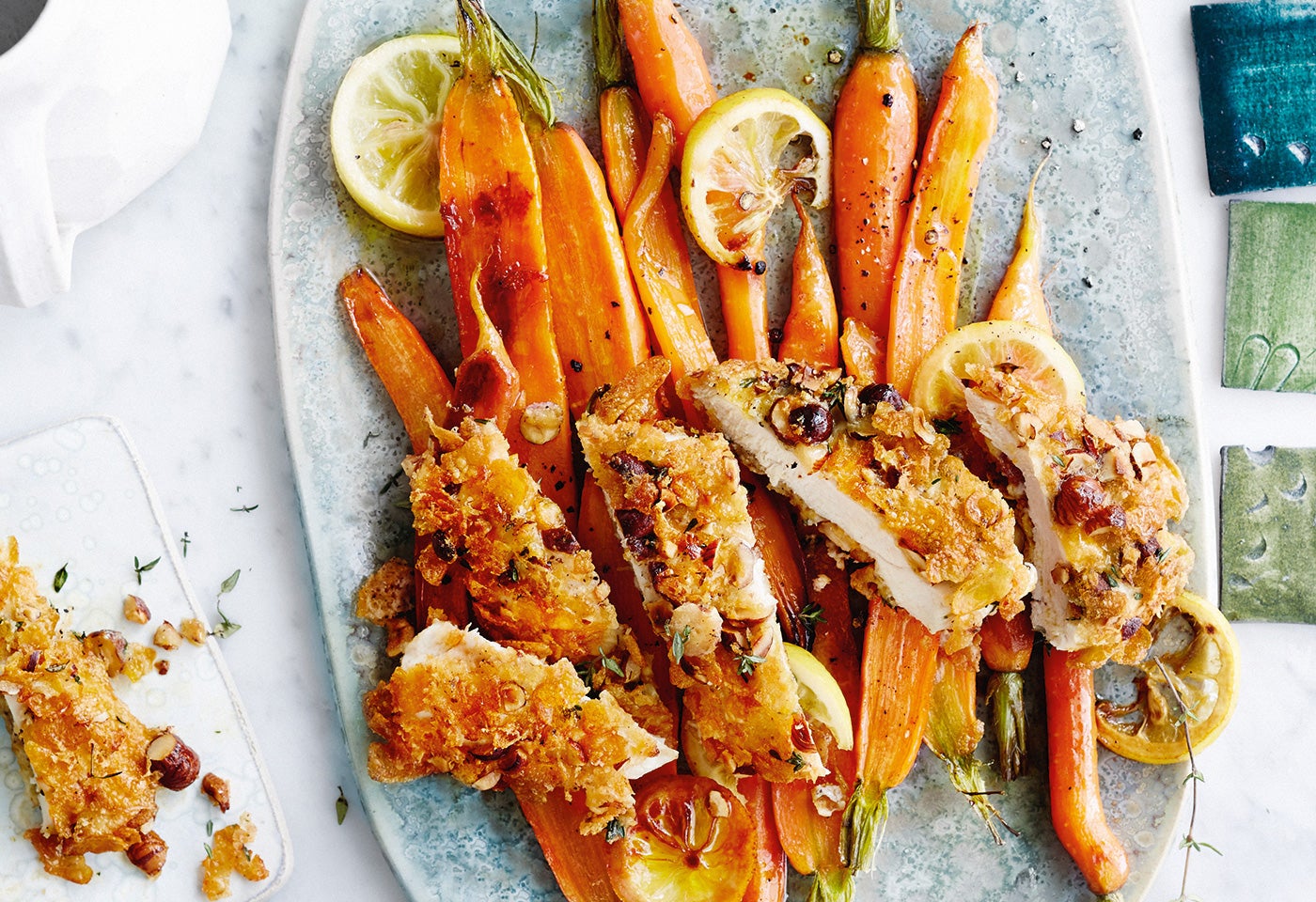 Hühnerschnitzel in Cornflakes-Nuss-Parnier mit Ofenkarotten