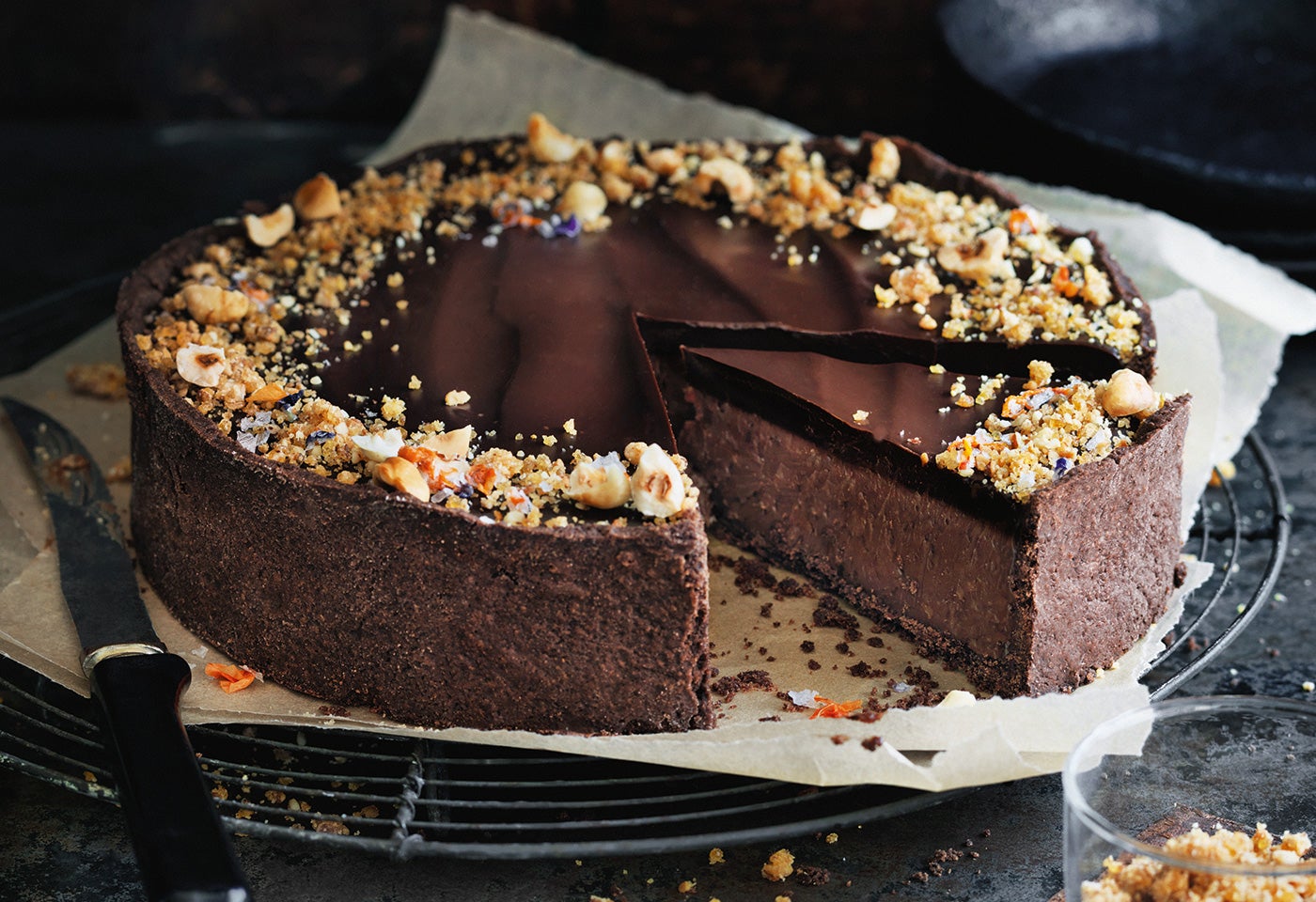 Schokomousse-Torte mit Nusskrokant und Blütensalz