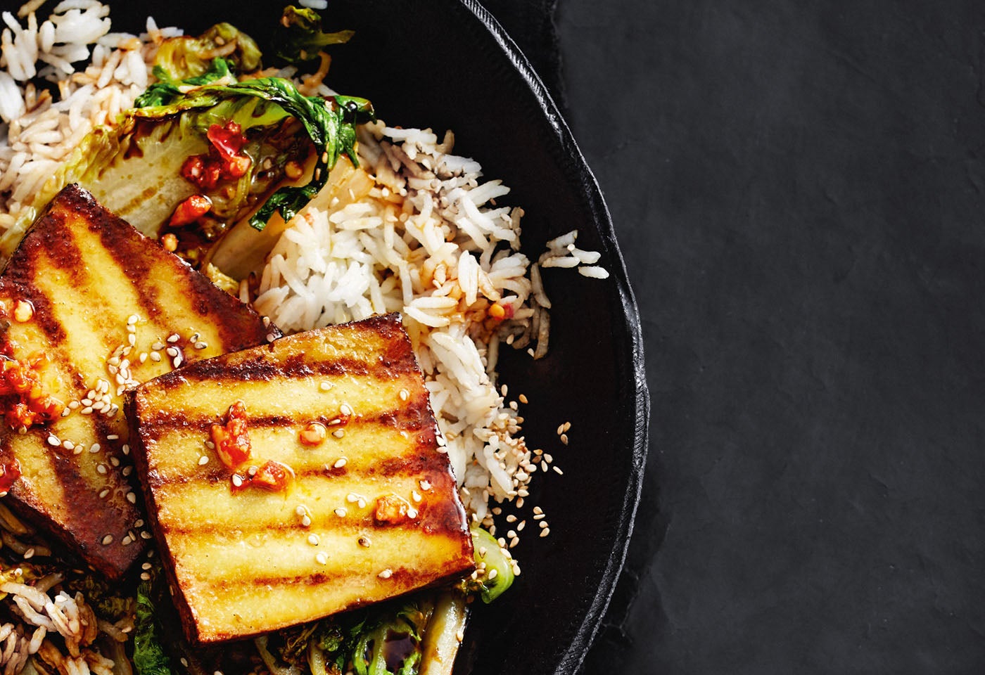 Geräucherter Tofu mit Reis und gebratenem Salat