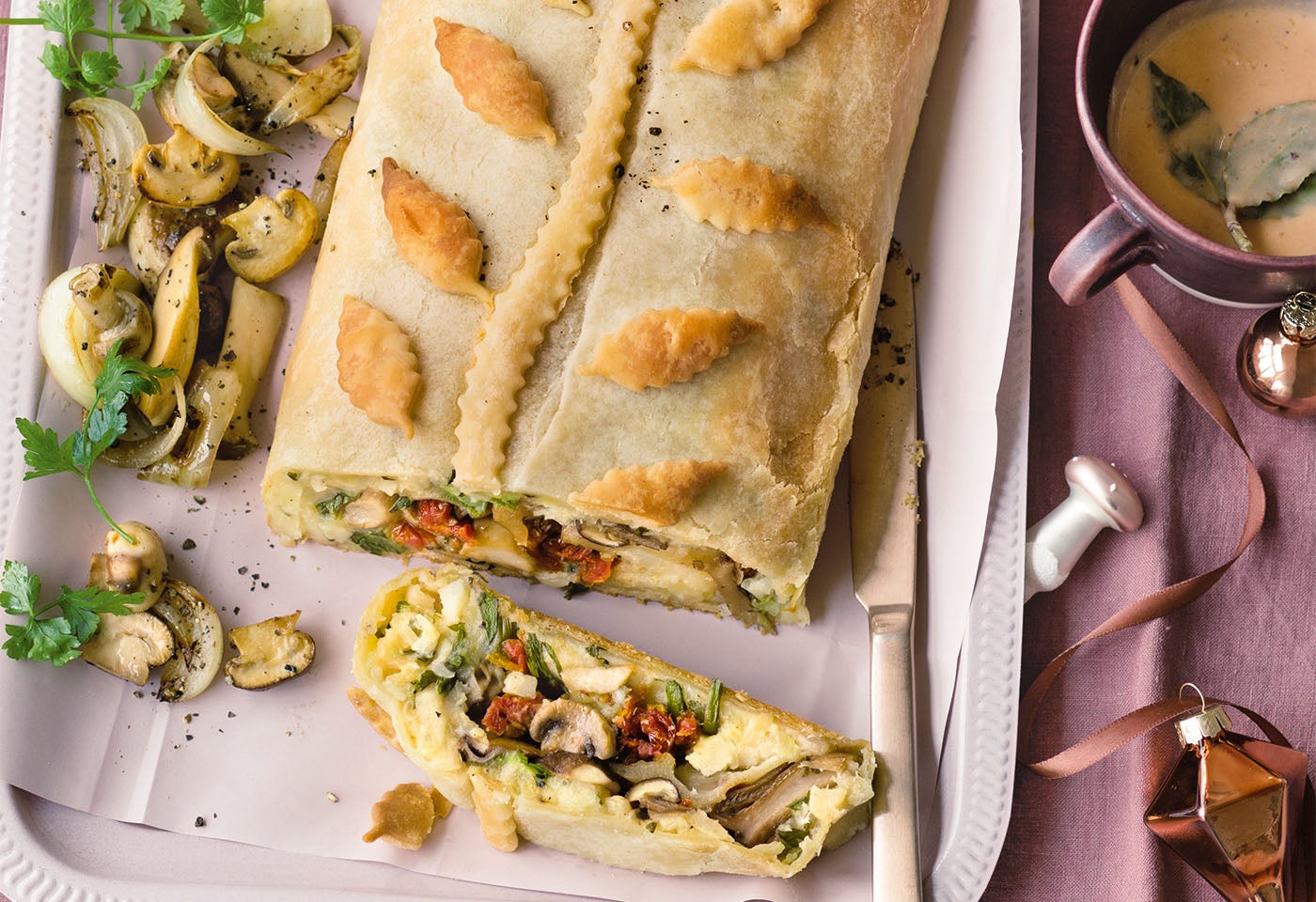 Feiner Gemüsestrudel mit Zwiebel-Pilz-Gemüse und Mandelsauce