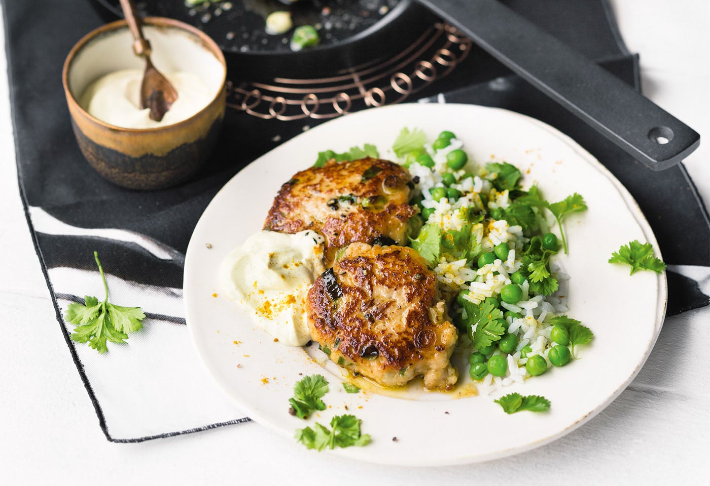 Fischlaibchen mit Erbsenreis und Curryjoghurt