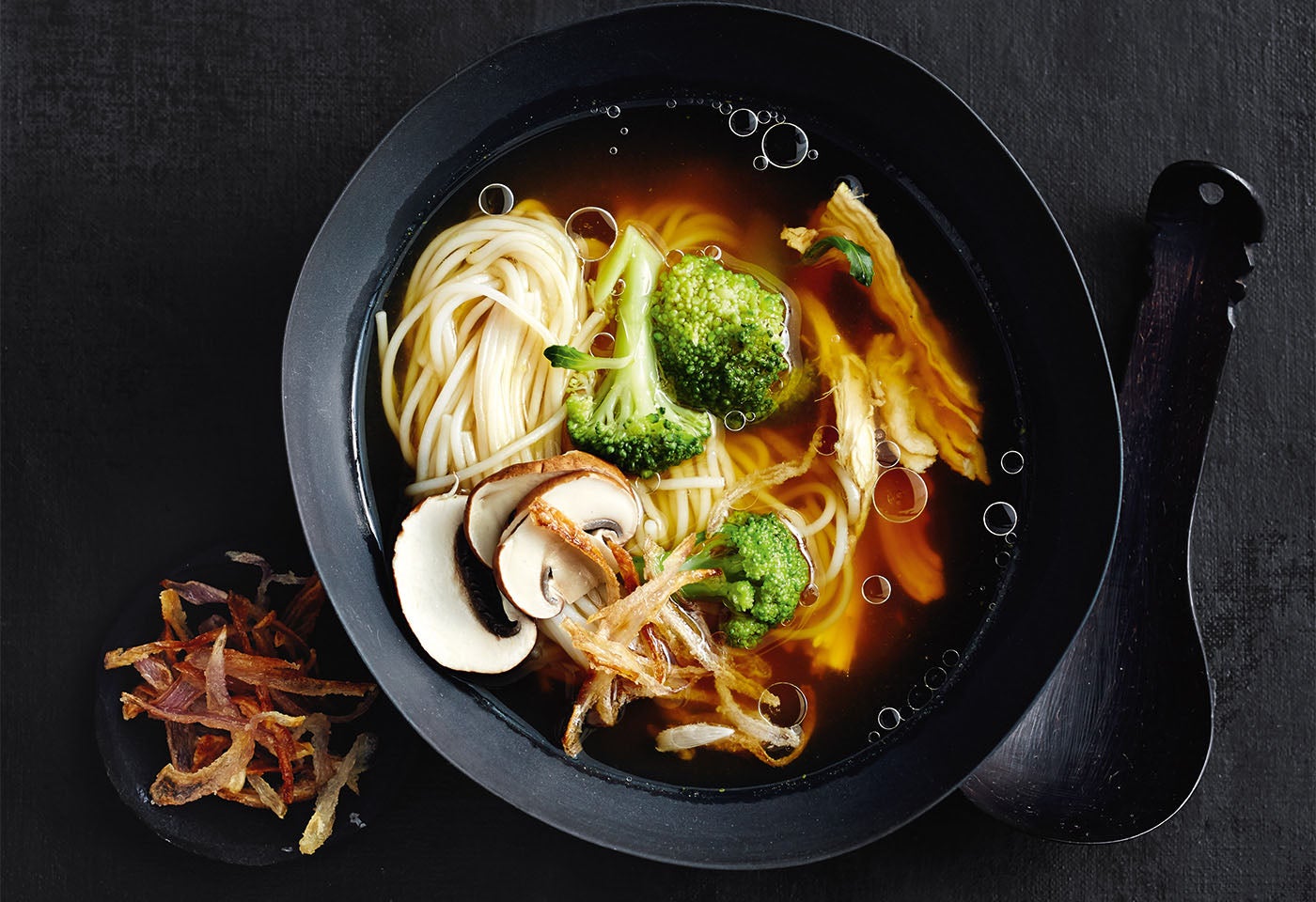 Asiatische Hühnersuppe mit Reisnudeln und Brokkoli
