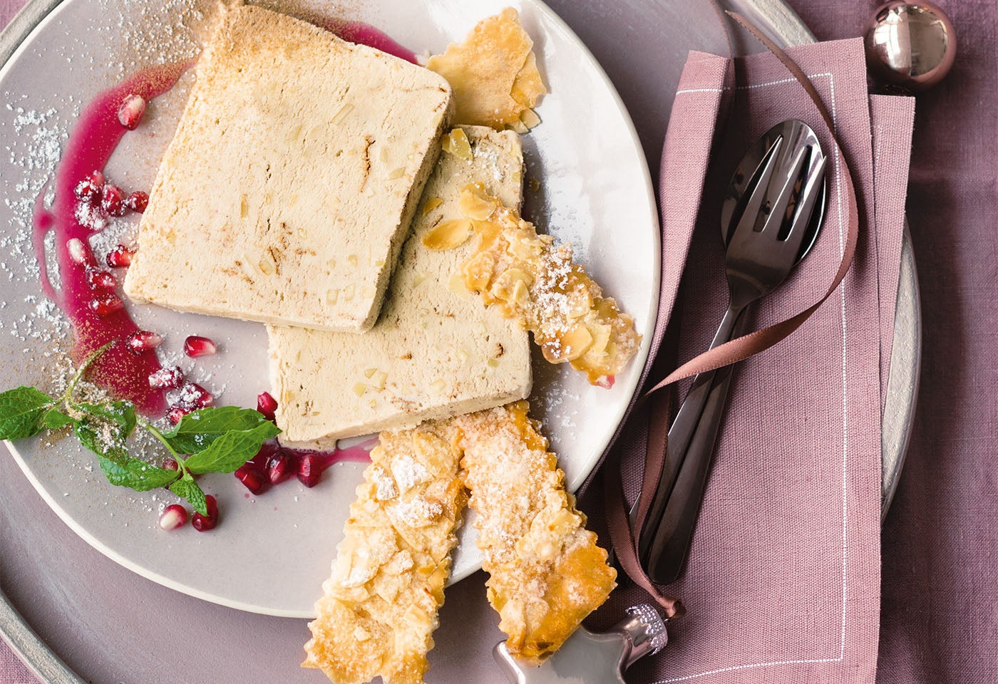 Zimt-Mandelparfait mit Mandelknusper und Granatapfel