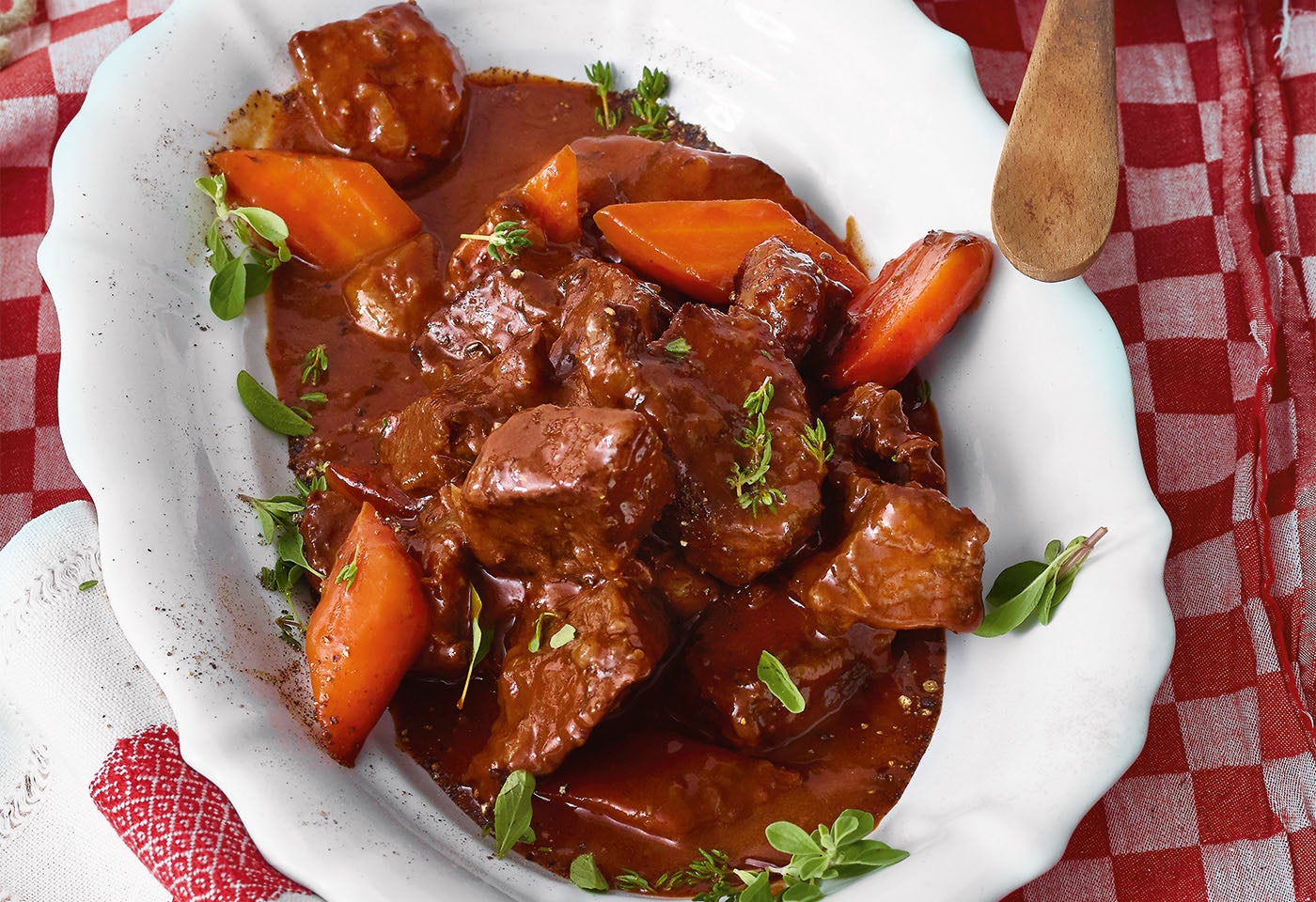 In Rotwein geschmorte Hühnerkeulen mit Erdäpfelpüree und eingelegten Oliven