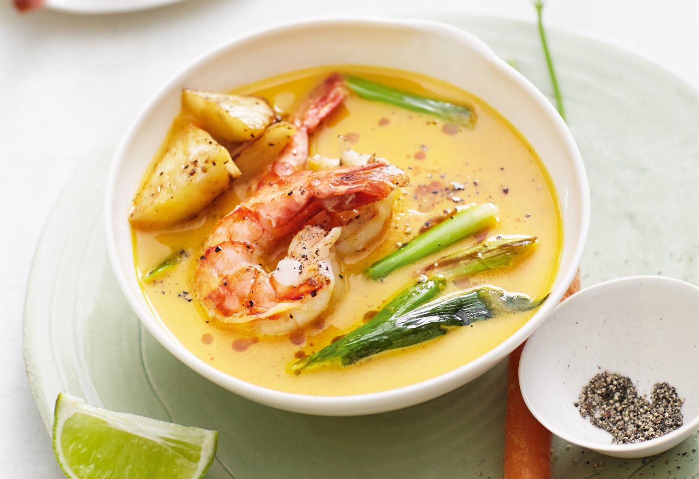 Karotten-Kokos-Suppe mit Garnelen und Ananas