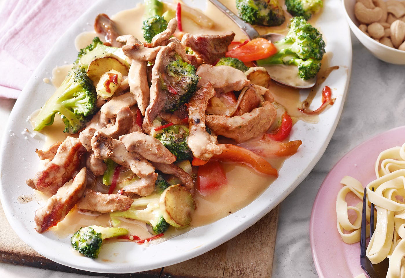 Schweins-Geschnetzeltes mit Brokkoli, Weinsauce und Cashewnüssen