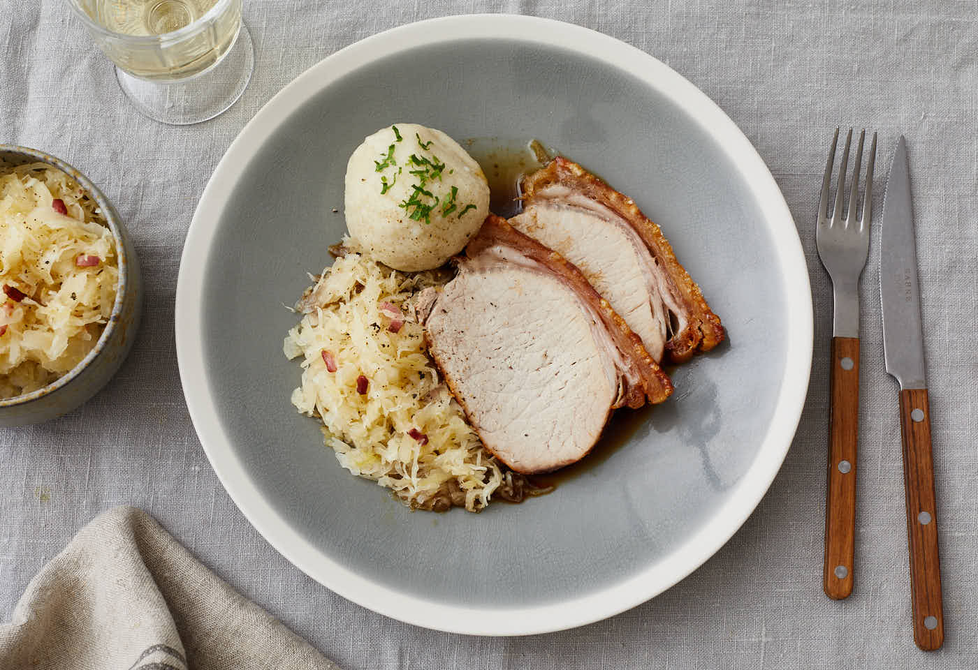 Knuspriger Schweinsbraten mit Erdäpfelknödel und Sauerkraut