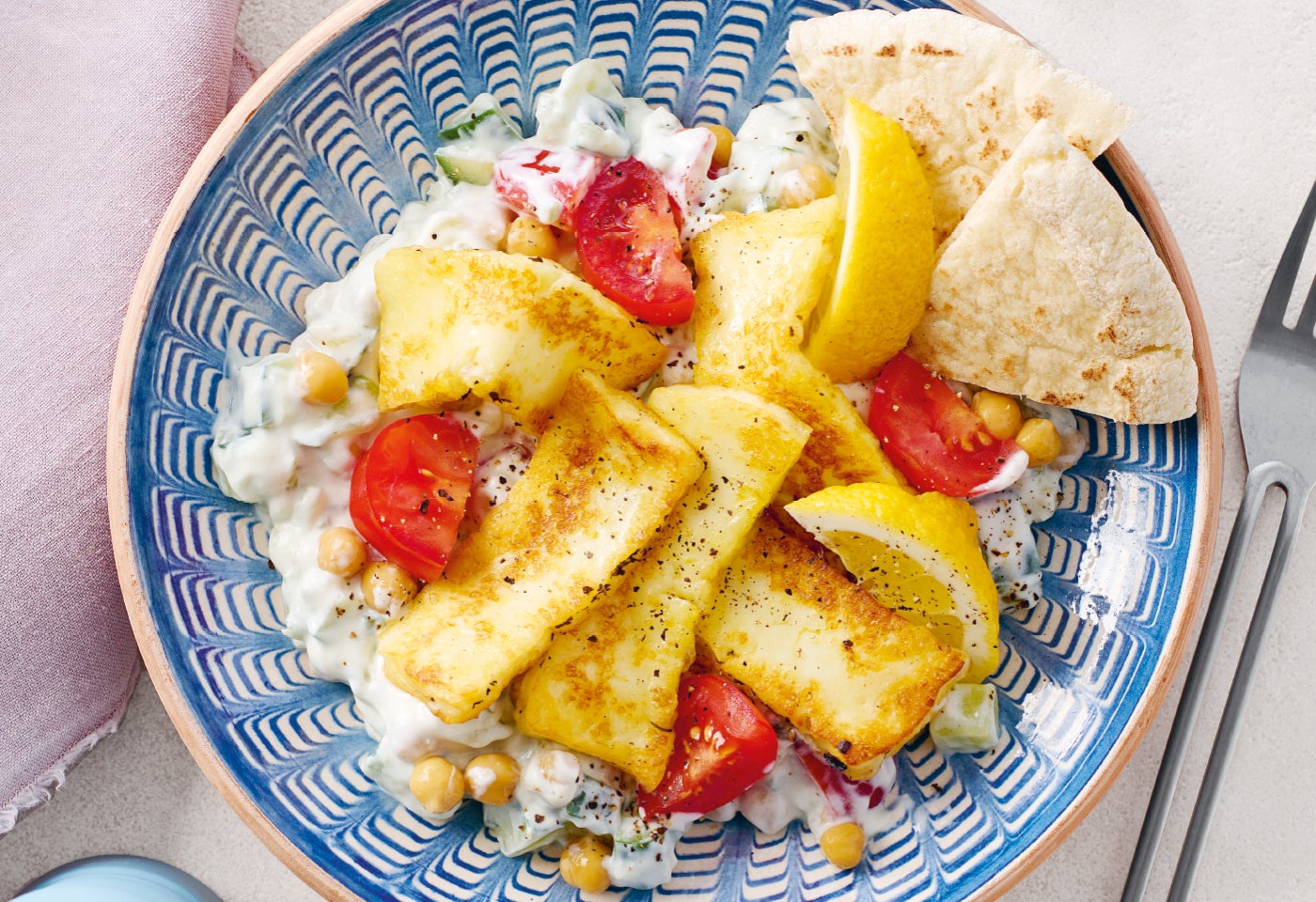 Grillkäse mit Kichererbsen-Tsatsiki-Salat