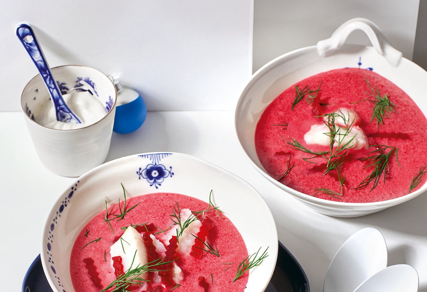 Saure rote-Rüben-Suppe mit Alaska-Seelachsfilet