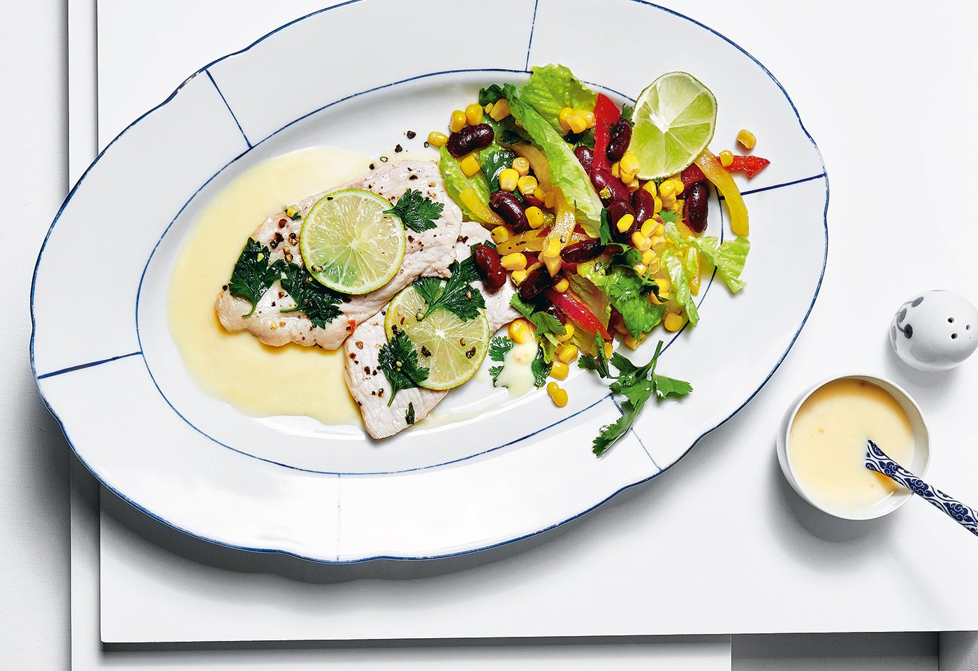 Gedünstete Schweinsschnitzel mit Käsesauce und Bohnen-Mais-Salat