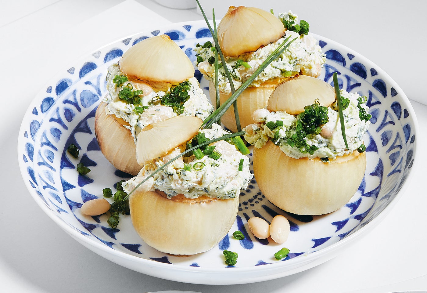 Gefüllte Zwiebeln mit Frischkäse und weißen Bohnen