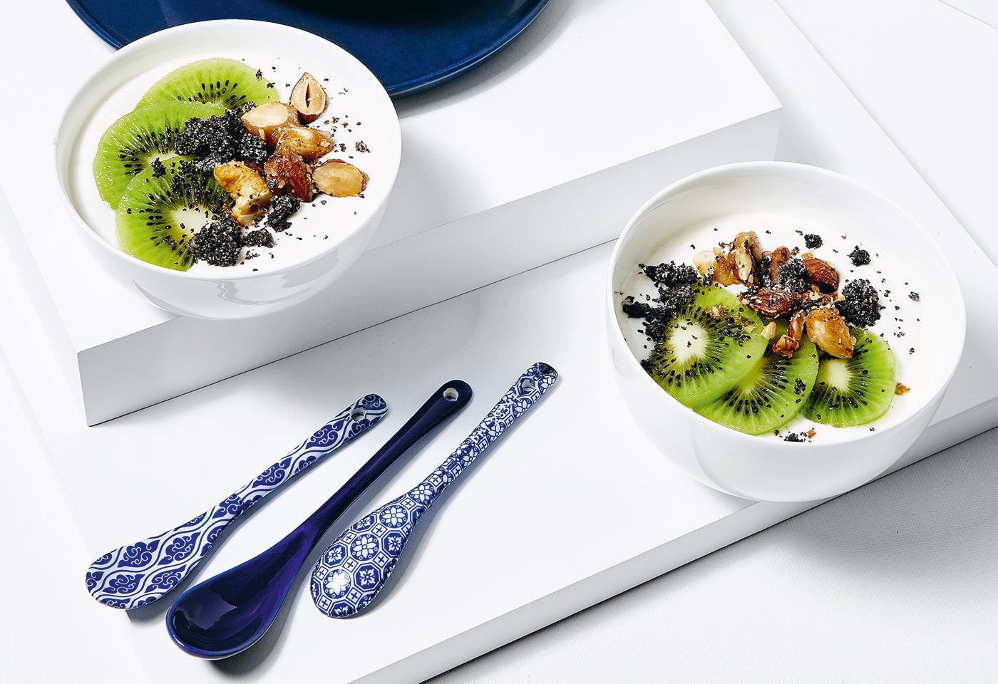 Kiwi-Joghurt-Bowl mit karamellisierten Nüssen und Mohn