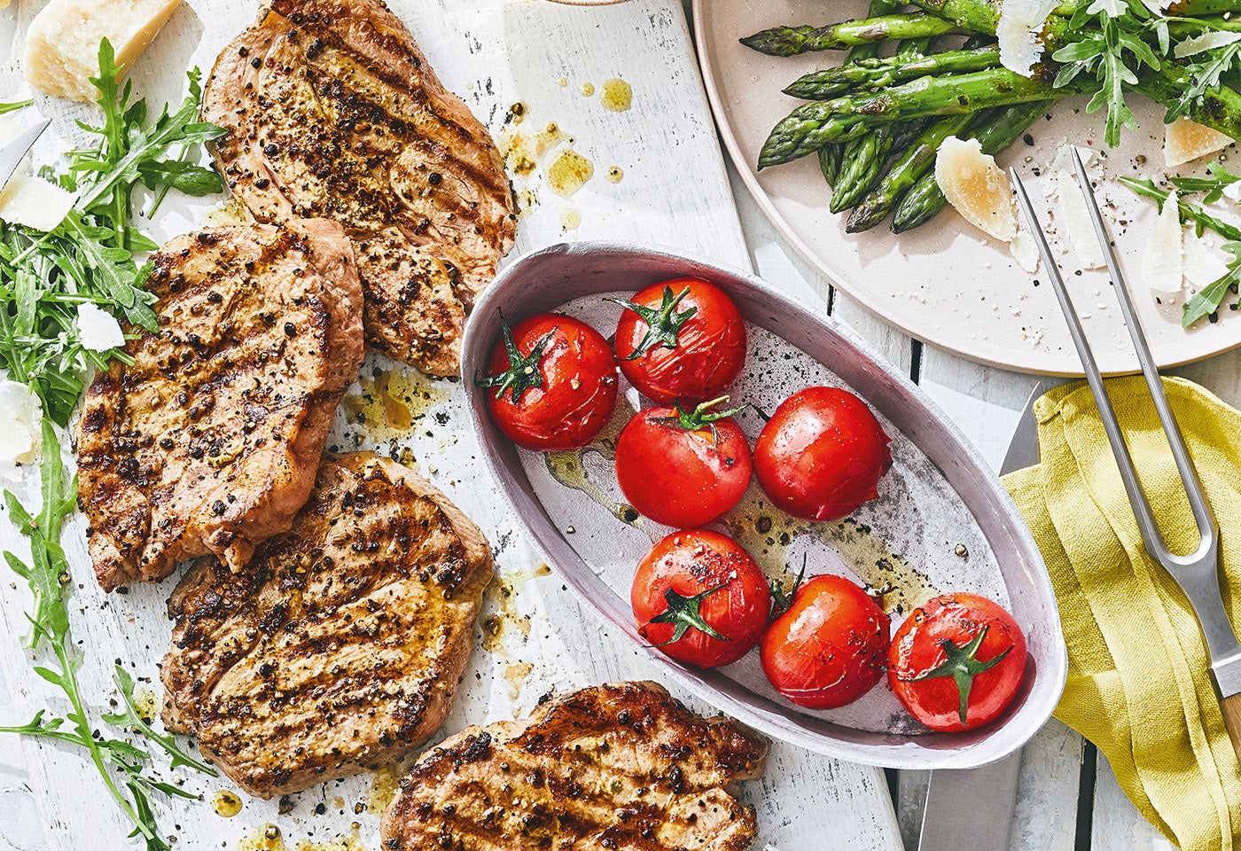 Schweinsschnitzel mit Paprikagemüse, Braterdäpfeln und grünem Salat