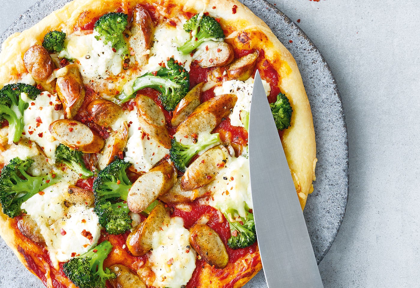 Schnelle Würstel-Pizza mit Ricotta und Brokkoli